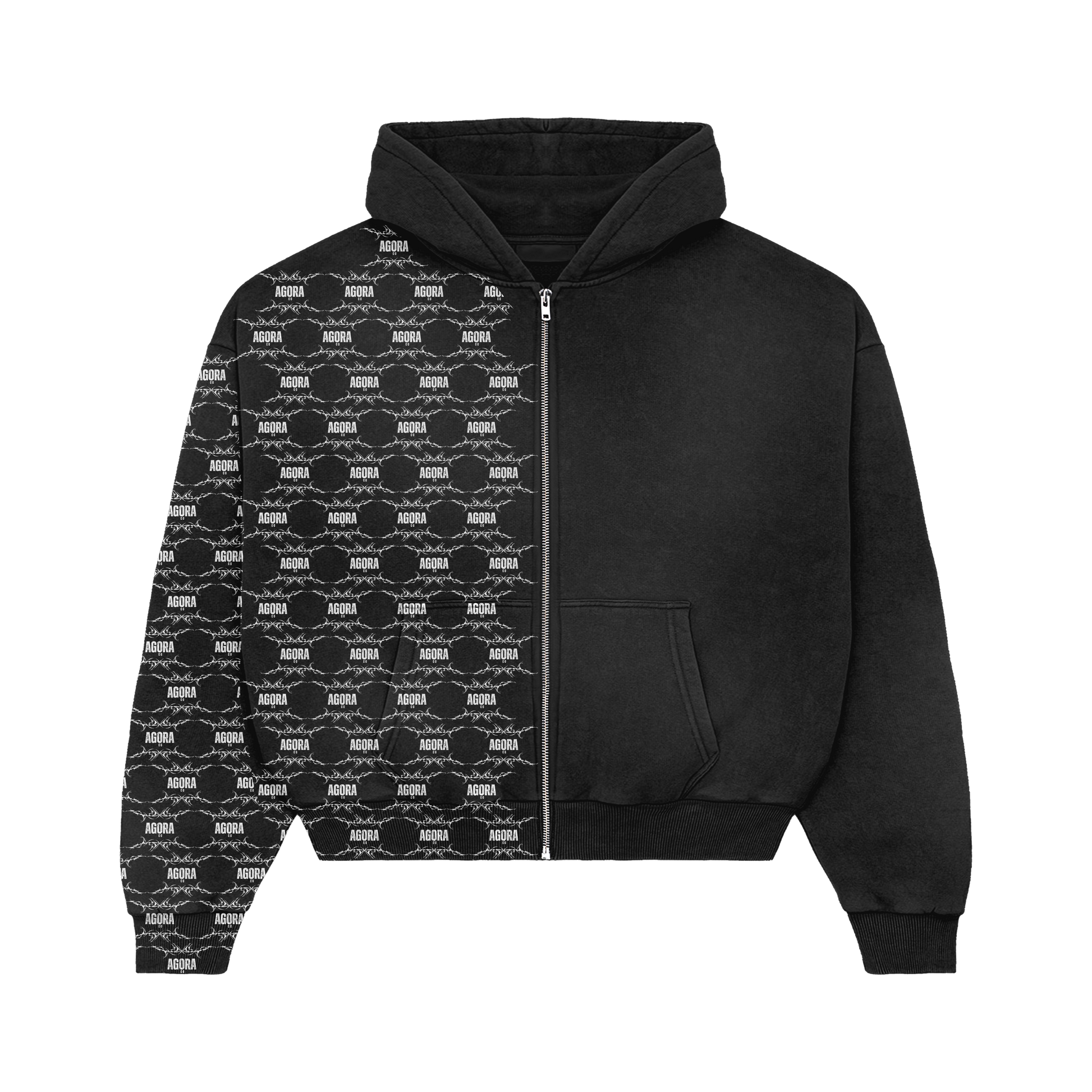 • Graphic: Split-panel barbed wire monogram (outer) / minimal waffle texture (inner)